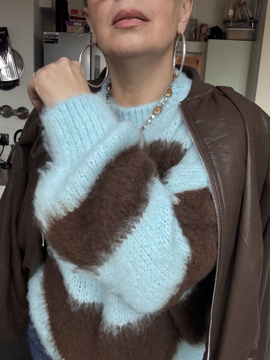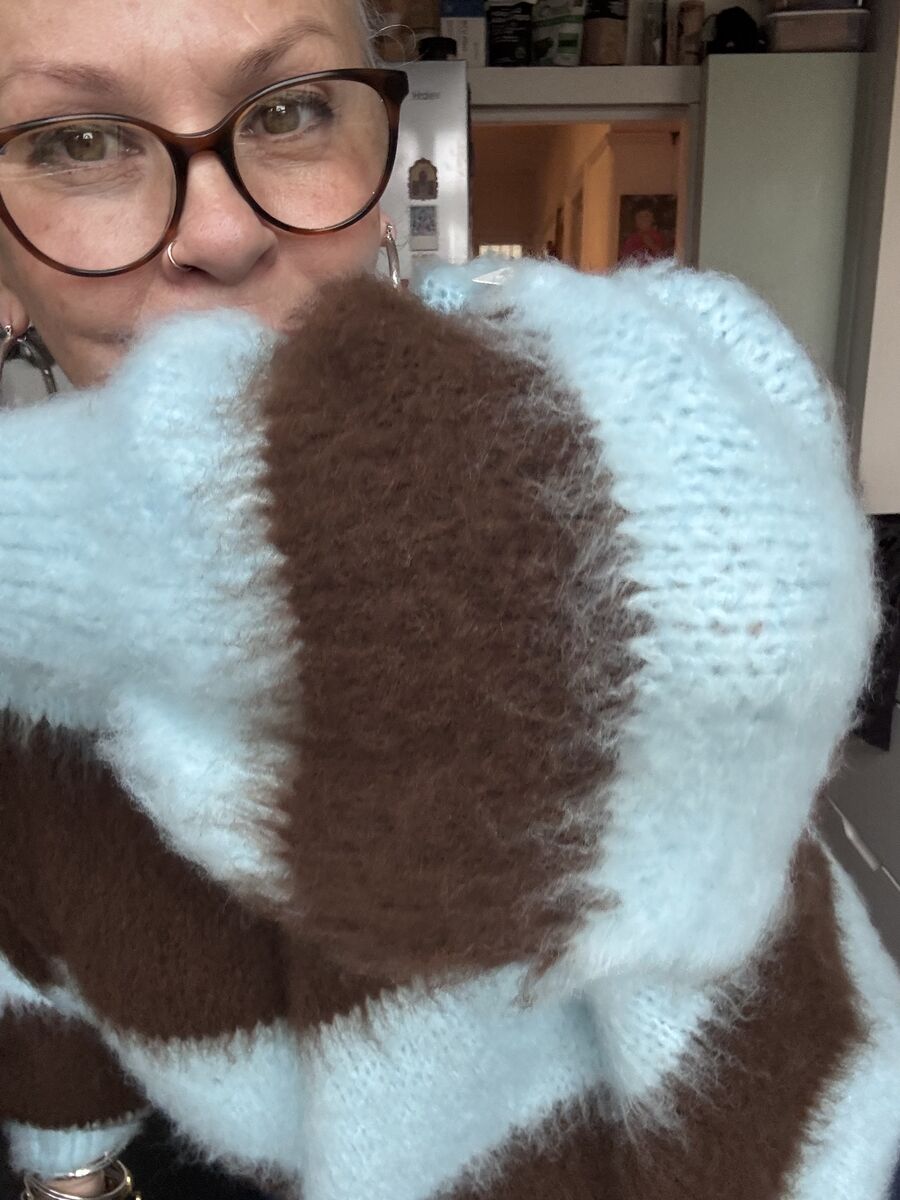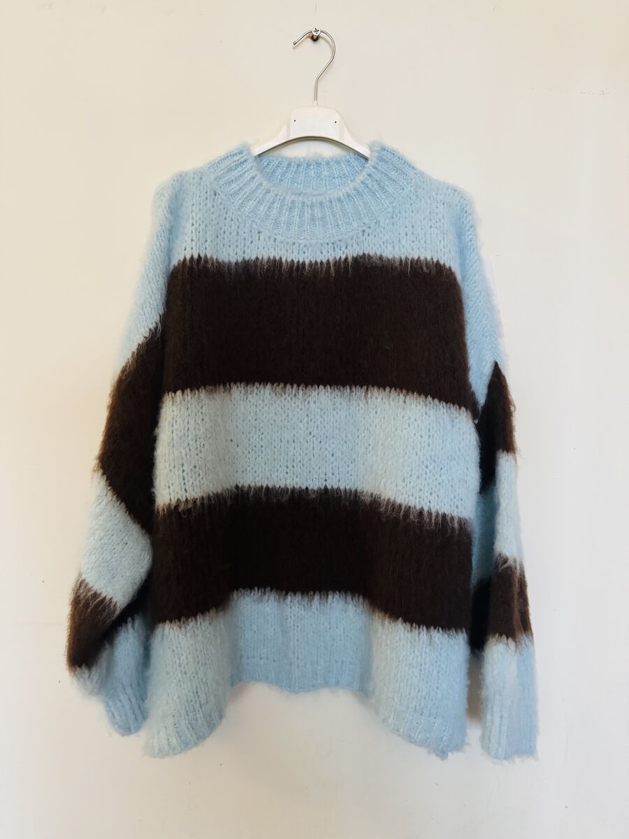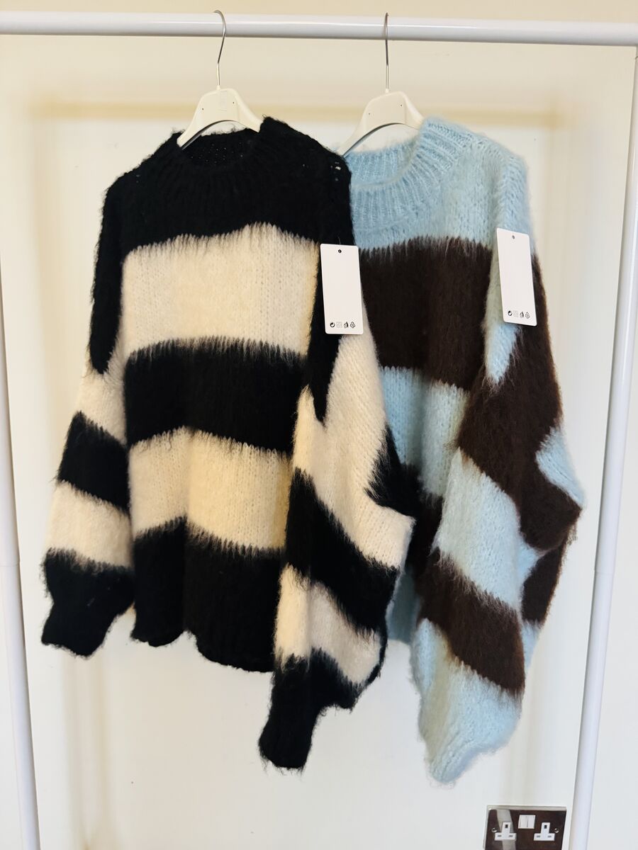 No returns lovelies. Love these , they bring back so many memories! Mohair style brushed knit , brown and baby blue stripes , oversized , easy to wear just as good for running around in or dressing up with some jewels and heading out .