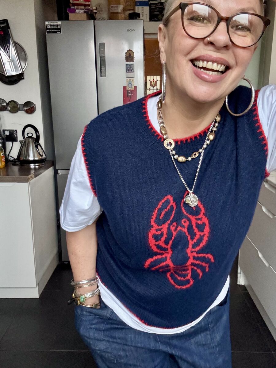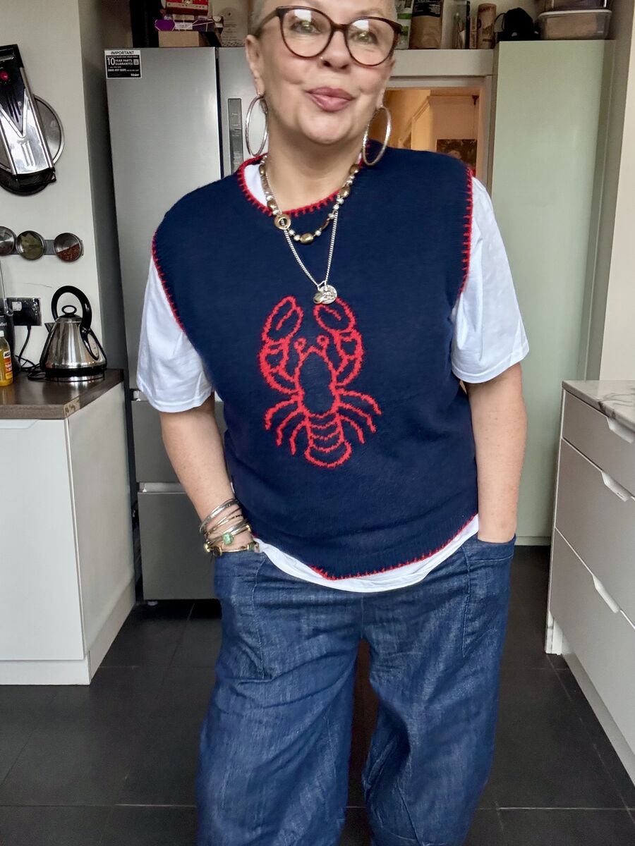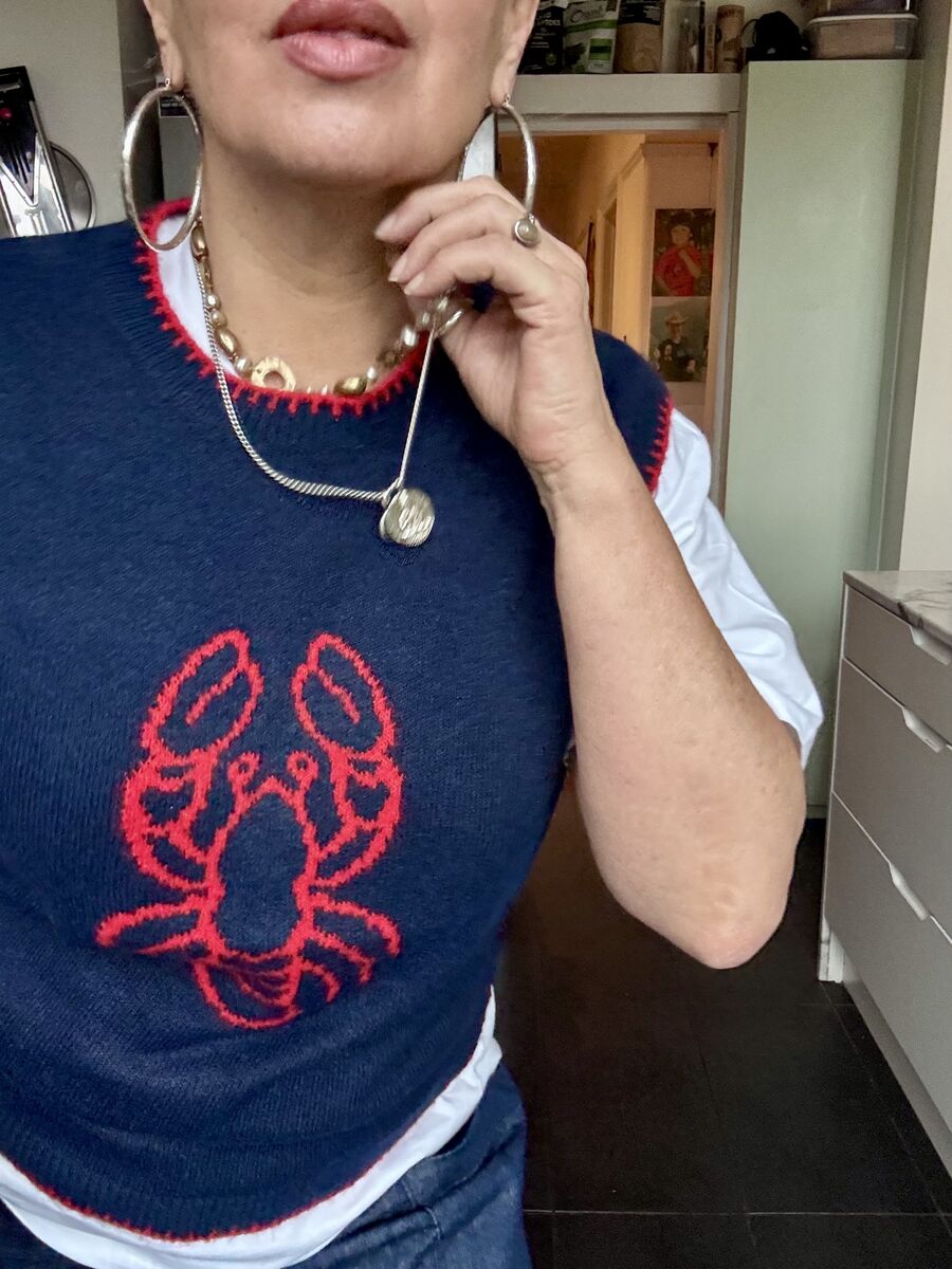 No returns lovelies. Super soft knitted tank top with lobster on the front and matching red blanket stitch running around the neck , arm holes and hem . Such a good piece to layer with , over T-shirt , shirts etc