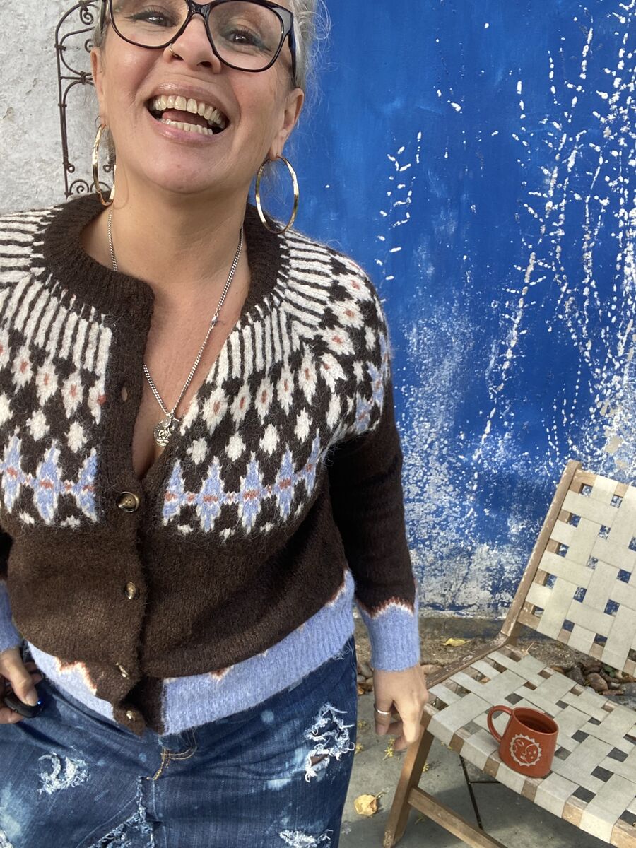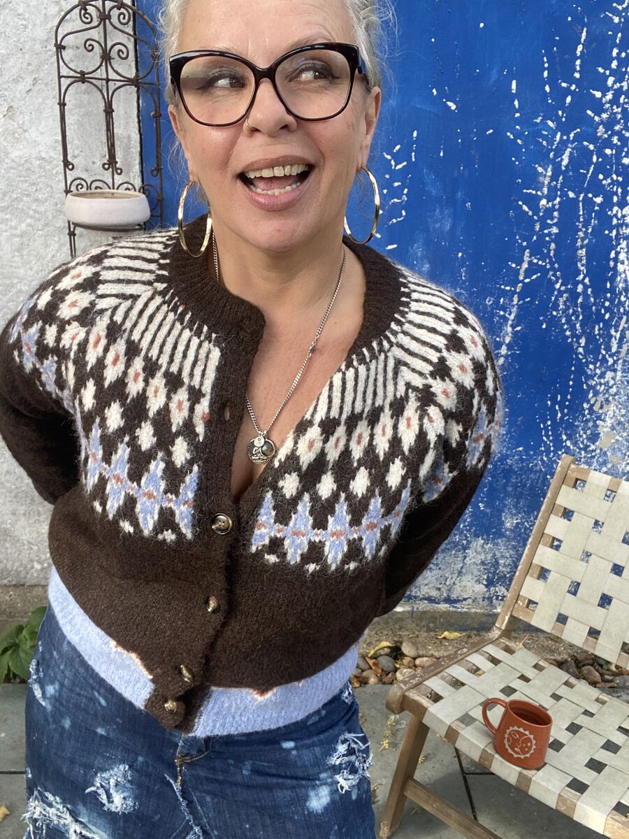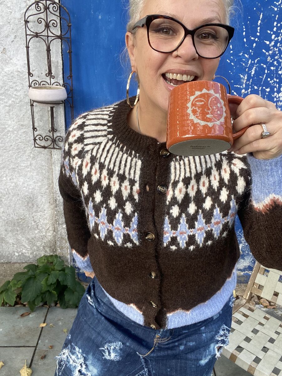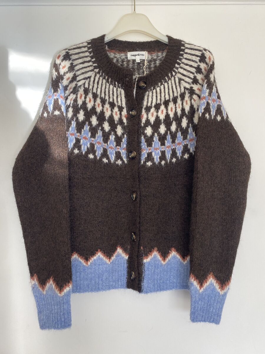 Gorgeous cardigan , in brown with blue , cream design on body and sleeves, front and back . Lush feel , super soft .