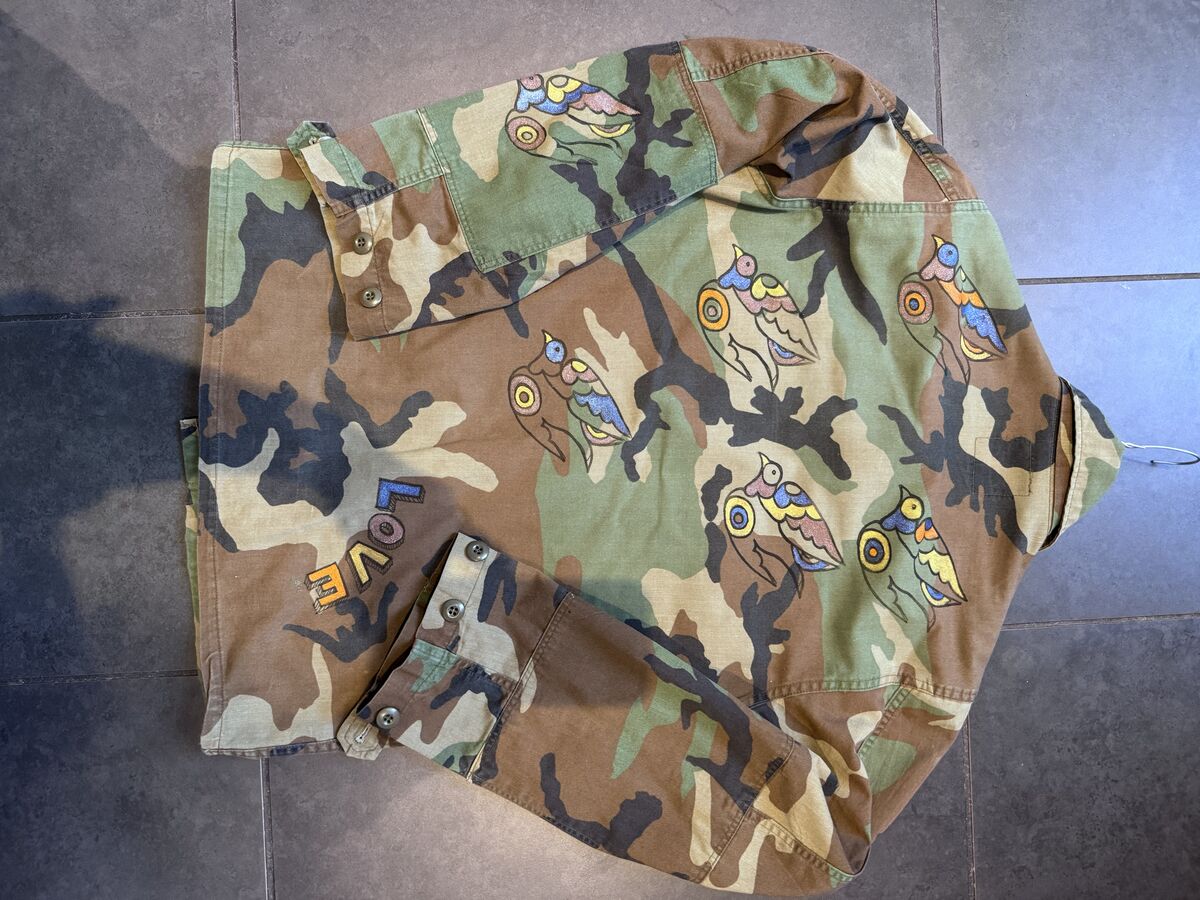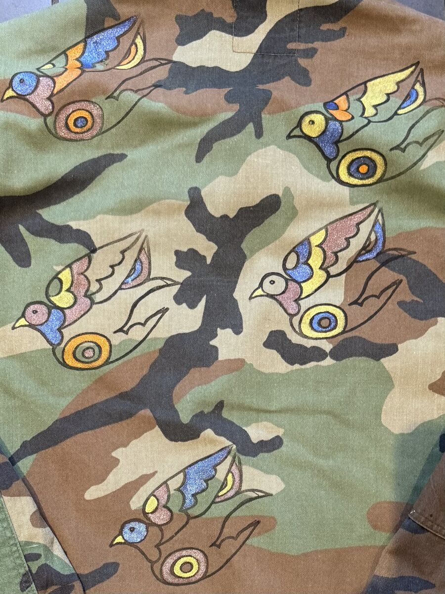 Reworked 80’s pre worn camo jacket. Shoulders and front pocket have vintage fabric and denim . Black sequin peace sign on the breast pocket . Back of jacket painted with doves and the word love . In golds , browns , denim blue and orange .painted dove on sleeve too … she’s gorgeous