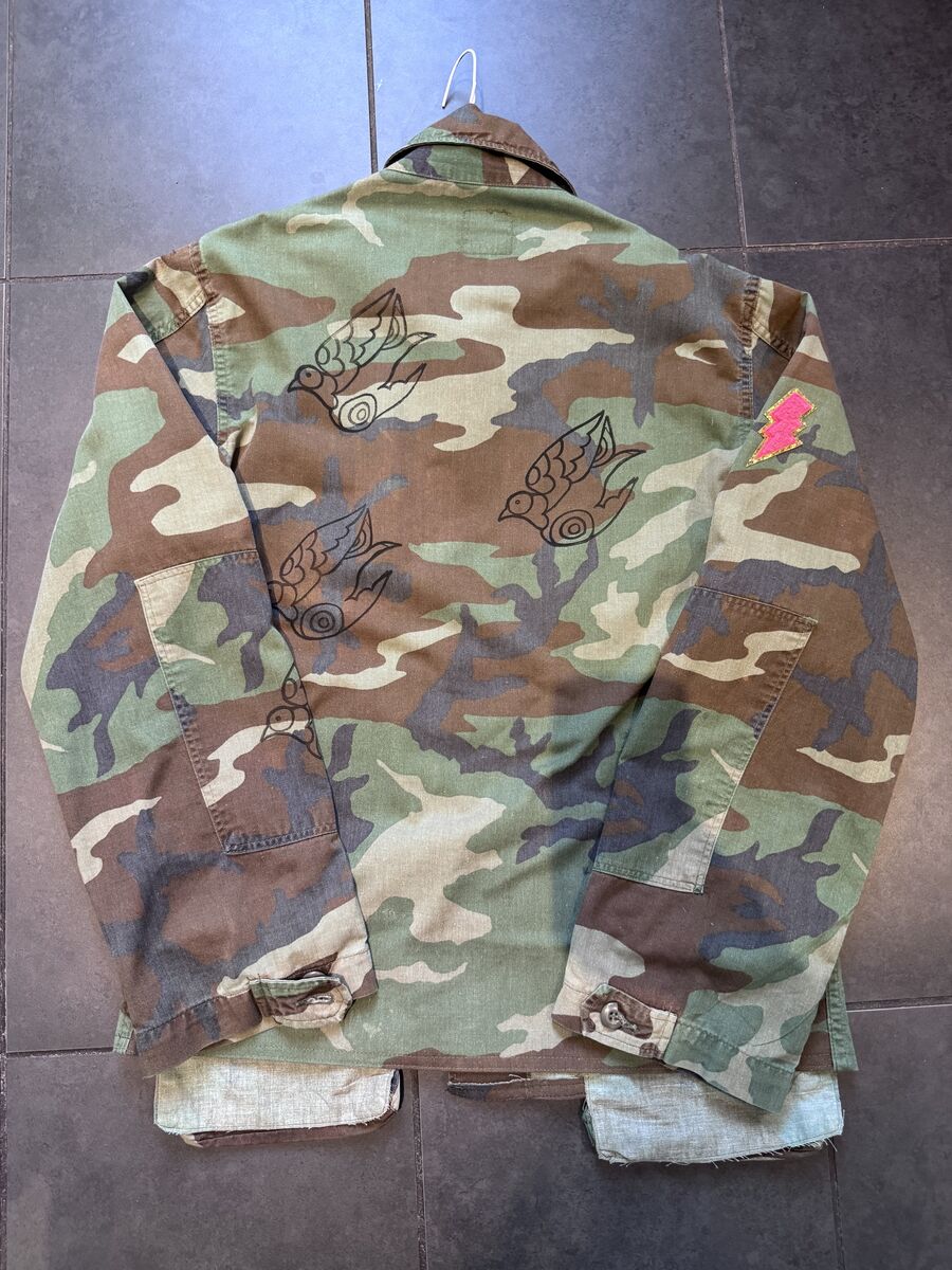 80’s pre worn camo jkt re worked . Pink smiley face on pocket , pink lightening bolt on sleeve , sequin peace sign on pocket . Stamped with doves on the front , back and sleeve . The front pockets drop lower than the jacket hem giving an interesting line . Vintage fabric details on the shoulders . Add more badges and broaches as you wear .