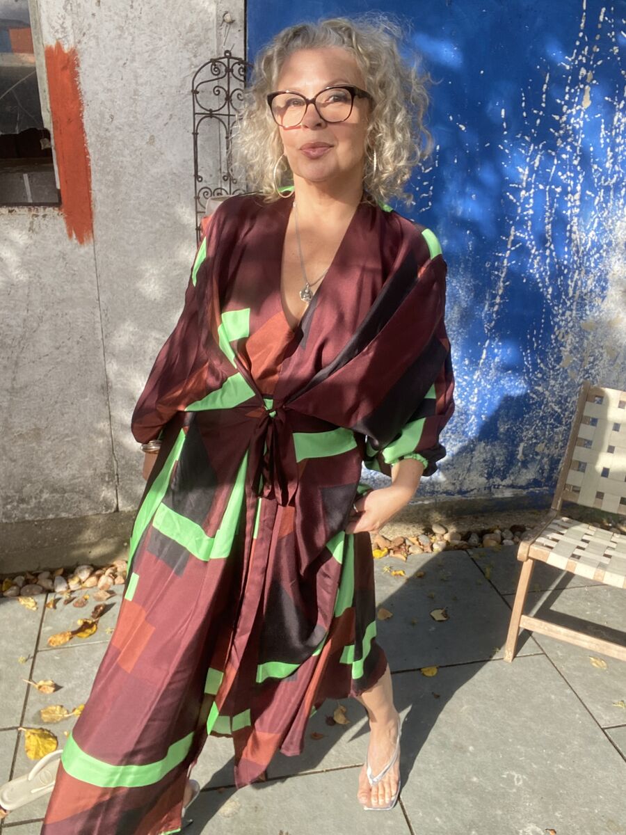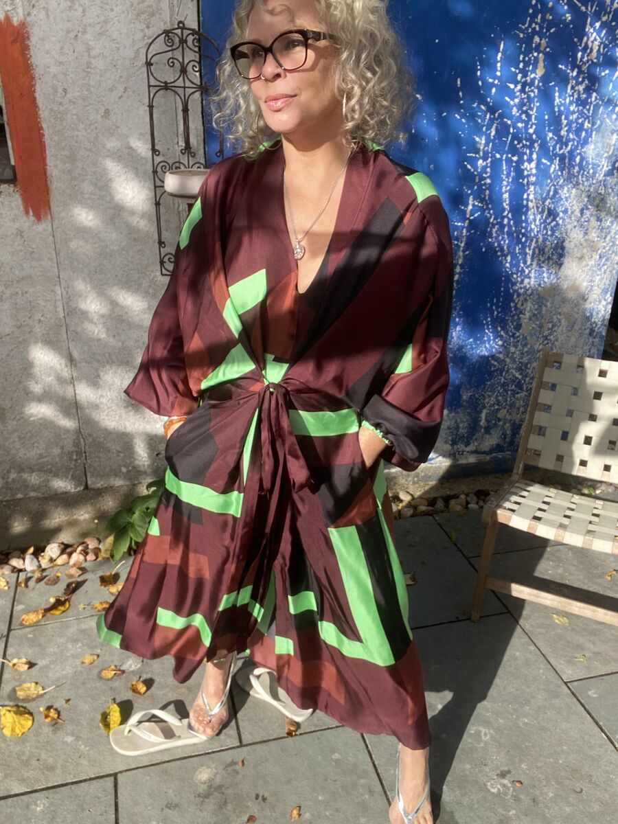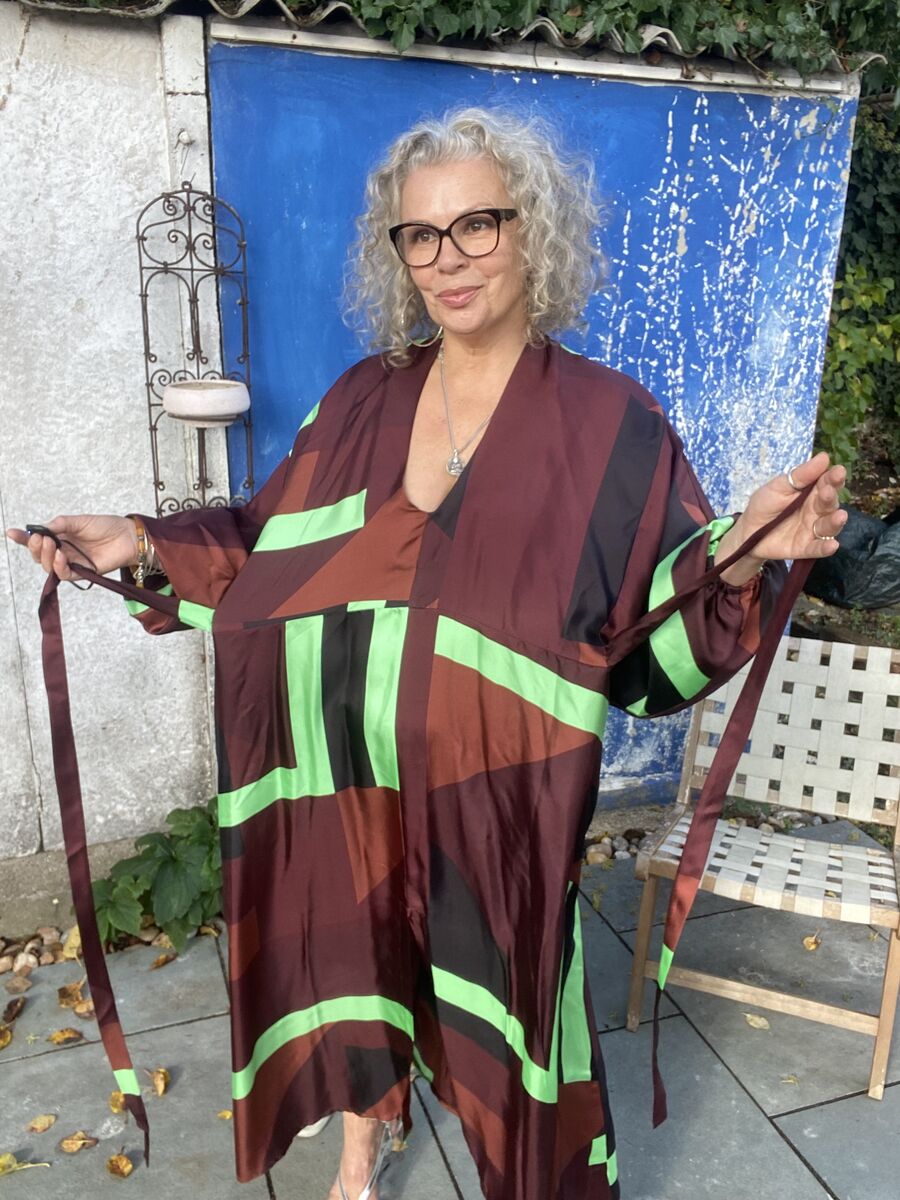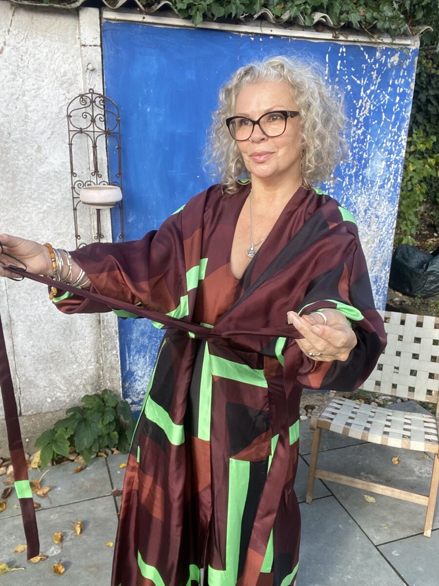 Limited edition, made from end of line silk , made in south London , utterly gorgeous, what’s not to love ! Deep v neck , batwing sleeves , pockets and front slit . This dress is floaty , feels beautiful on the skin and has ties that make it easy to wear . Can be worn like a kaftan or tie in the front still leaving some movement or you can wrap it round, sinch in your waist and tie in the front or back . I love it and have two .